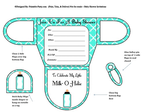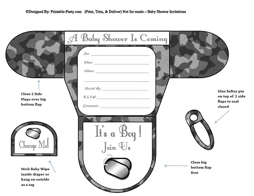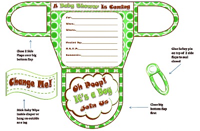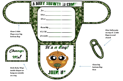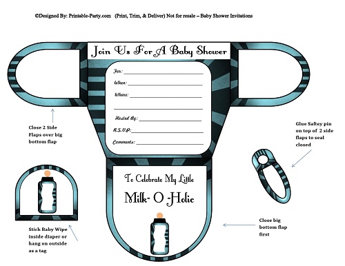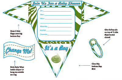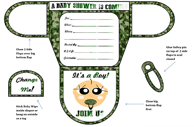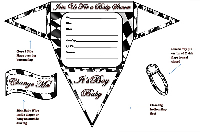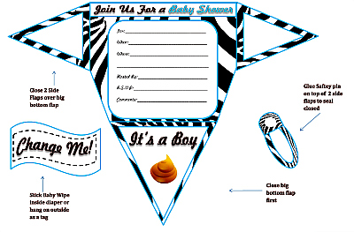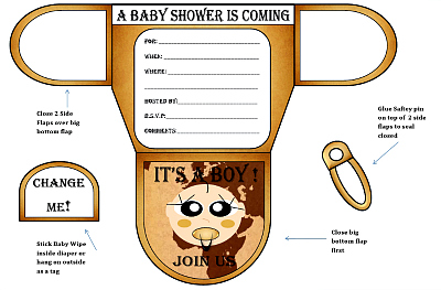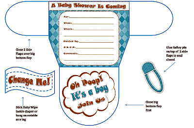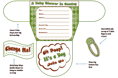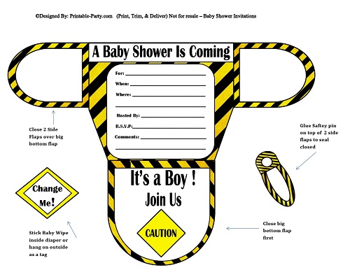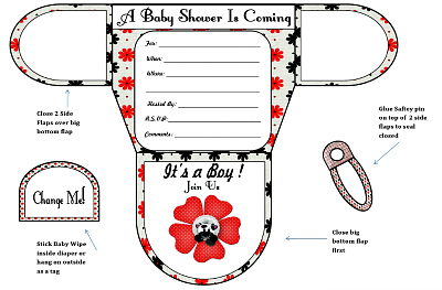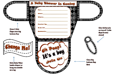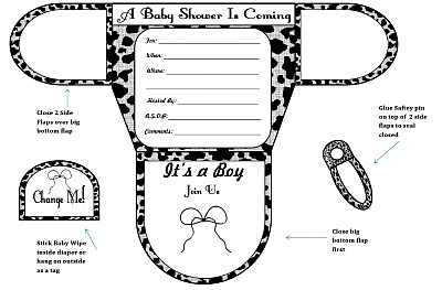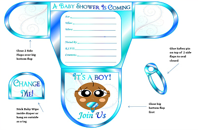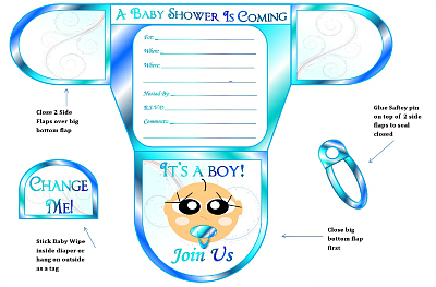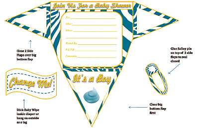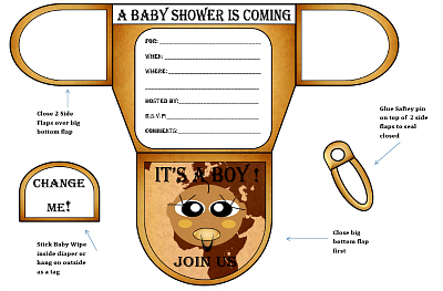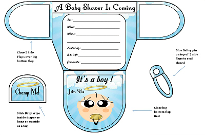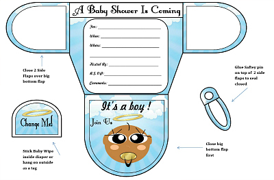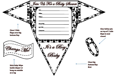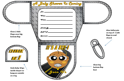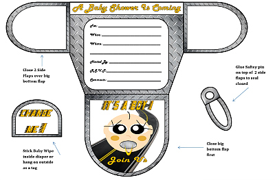 A unique selection of boy diaper baby shower invitations that are printable for instant download . All diaper invites has a classic white color on the outside with a blend of unique designs & themes on the insides. All invites include full assembly instructions. Includes a safety clip