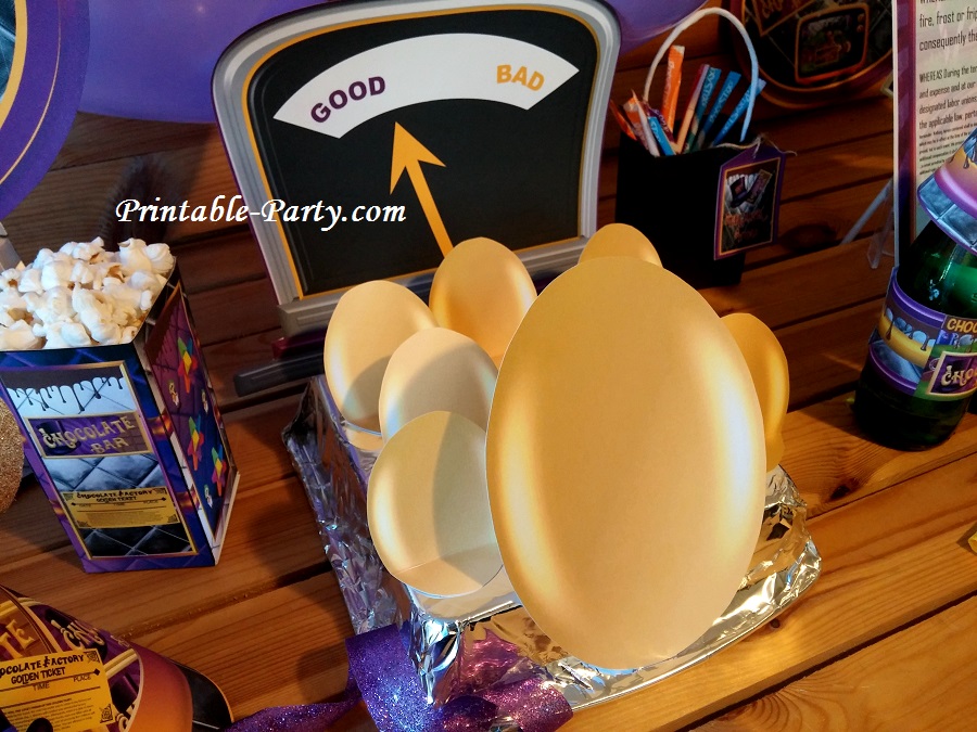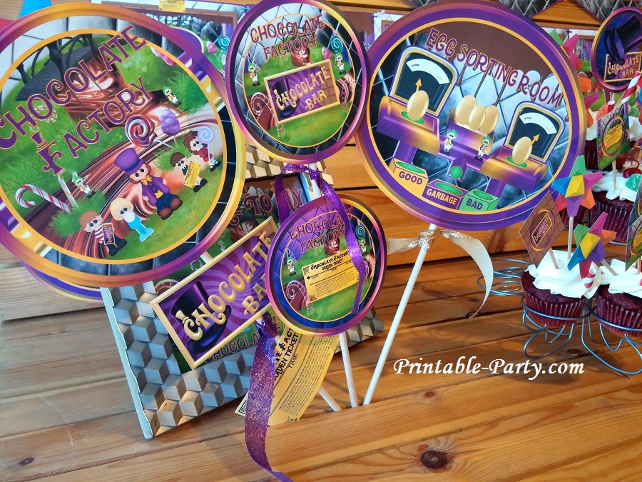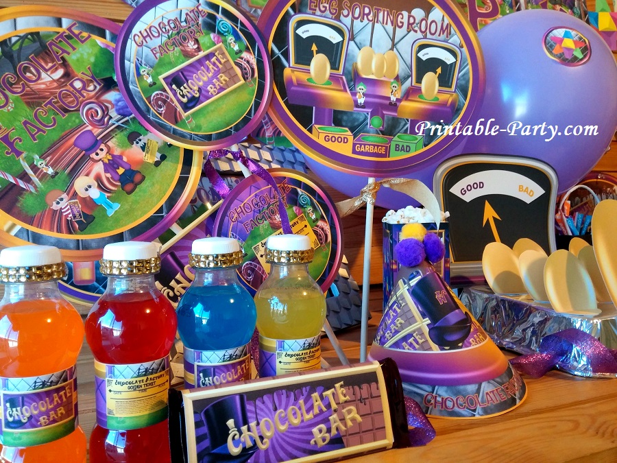 This theme will make you want to become a chocolatier! Have fun creating a super fun tour of your very own chocolate factory. Take your guests on a whimsical adventure to your wacky & wonky invention rooms. This printable digital party pack includes a lot of the items you may need to create cool invention rooms of your own. See what's included below.