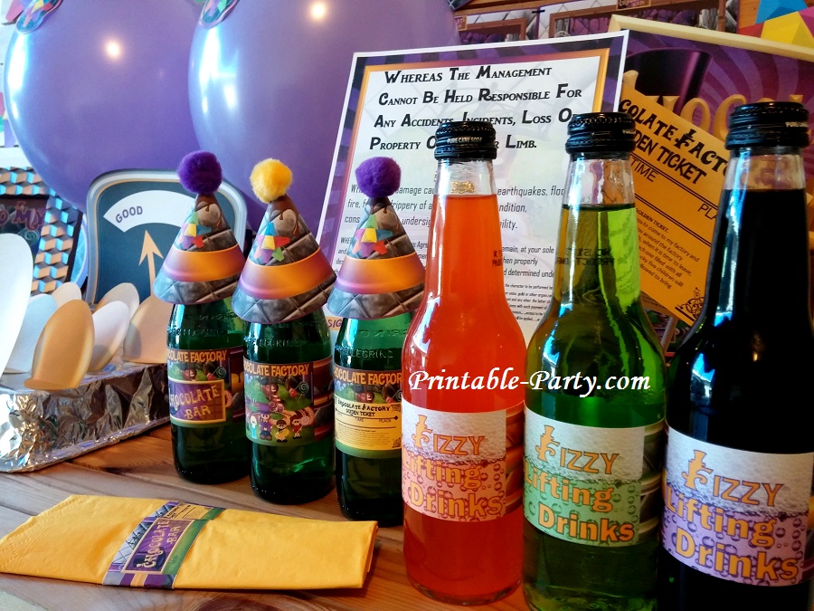 Chocolate Factory Bottle Labels - Drink & bottle labels 6 Designs. You get 3 fizzy lifting drink labels & 3 chocolate factory themed personal sized bottle labels. Fits around any personal sized bottled drink.