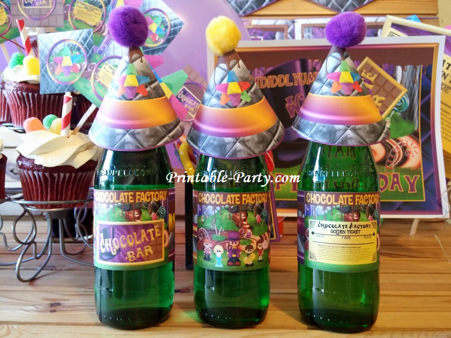 Chocolate Factory Printable Hats - Standard cone party hat 1 Design. Mini cone bottle topper hats 2 Designs. Mini hats can be used as bottle toppers or they can be used for table decoration.