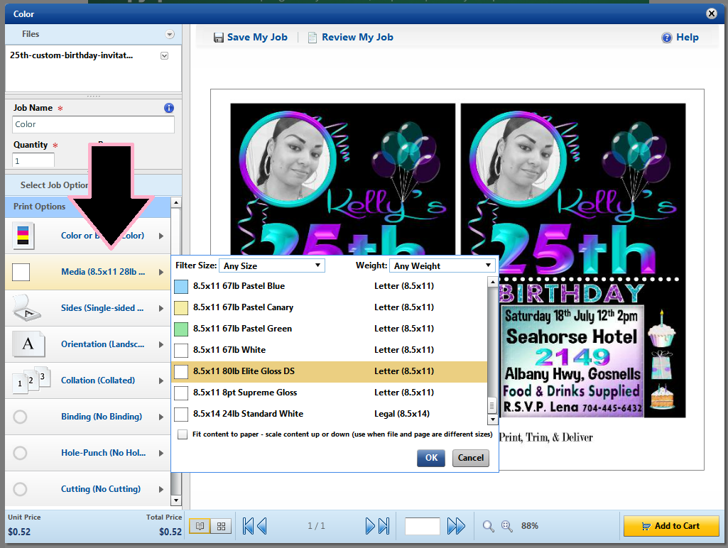 9. Now that the orientation & color of the page is right, we want to select the type of paper we want our invitations printed on. We are gonna choose a thick glossy paper for our invitations this time. Tip: The price may vary for different paper types. |