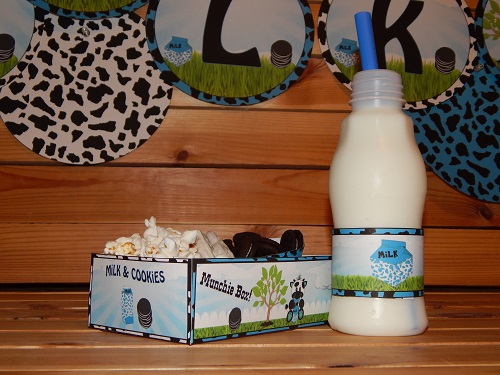 Milk and cookies printable birthday party supplies for yummy celebrations. Who doesn't love a tall glass of ice cold milk with cookies? Embellished with blue, white, & black cow print in a grassy field of sunshine. Little cows with milk boxes & stacks of chocolate sandwich cookies are seen throughout this unique design. You can use this printable party to create a fantastic looking party that will wow your guests. Great for any age & can be used repeatedly. No sharing or resales. Downloadable Orders are available to you instantly after purchasing via a link. |
