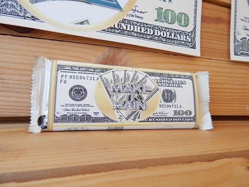 Make It Rain Candy Bar Wrapper Favor Candy bar wrapper party favors. A great way to say thank you for coming to my party. These wrappers fit around a regular sized 1.55 oz Hershey brand chocolate bar. |