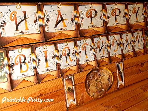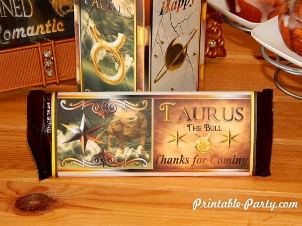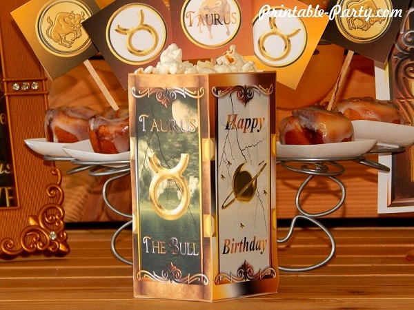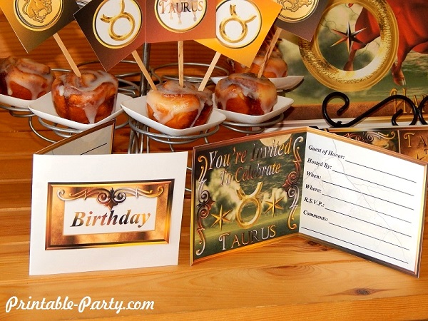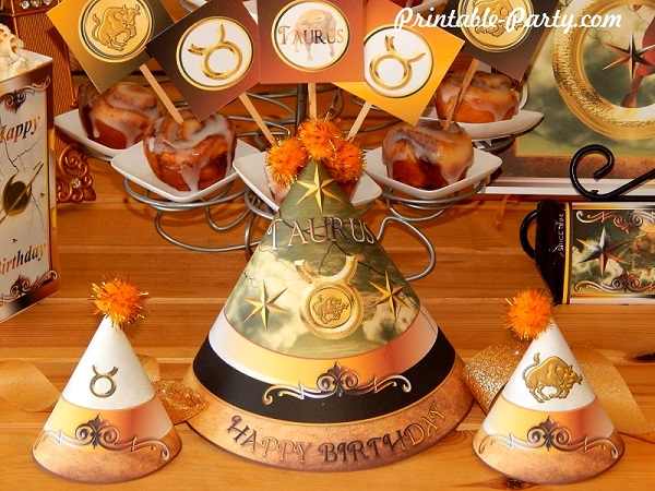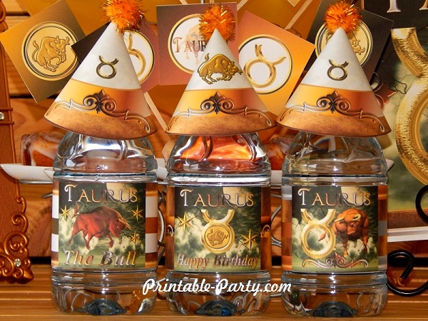 Taurus printable zodiac party decorations for birthday celebrations. Celebrate your party in style with exclusive & original horoscope sign themed party printable decoration. All the details in this theme are design to bring a classy western look & style to your celebration. You'll find blended colors of shiny gold, brown, black, & white throughout this theme. Golden Taurus zodiac sign symbols & bulls are added to make this theme pop. |